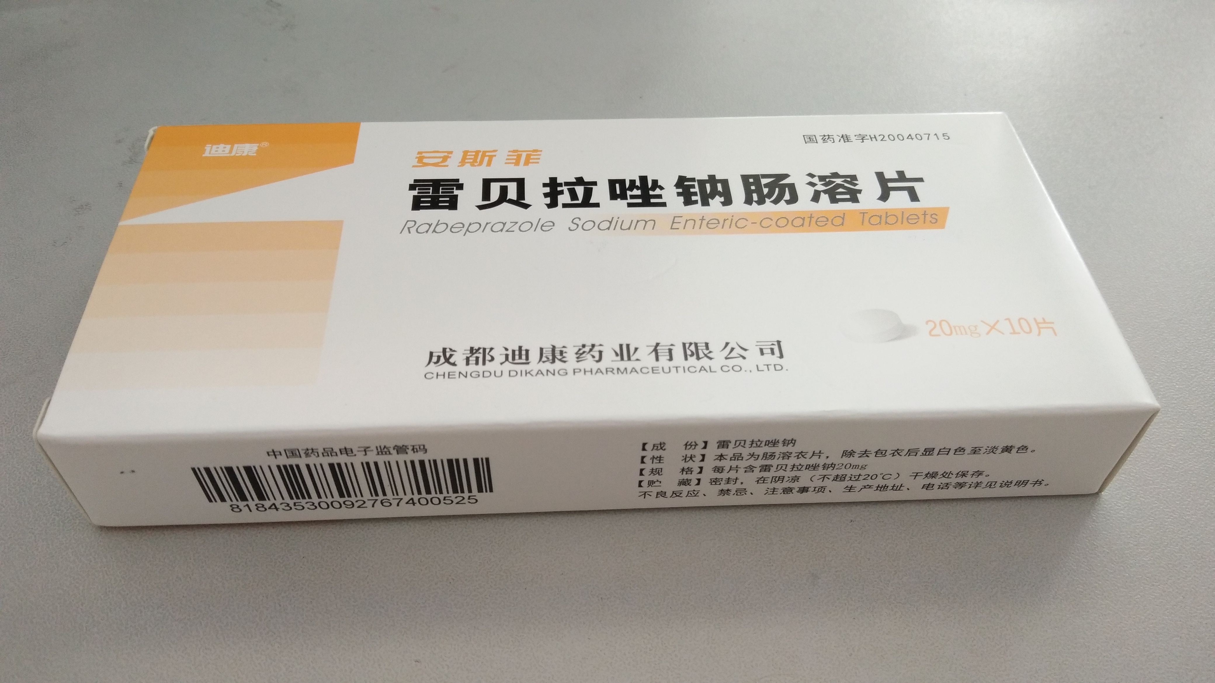 【藥品名稱】雷貝拉唑鈉腸溶片 【商品名/商標】 安斯菲/迪康【規(guī)格】20mg*10片 【主要成份】雷貝拉唑鈉腸溶片主要成份為雷貝拉唑鈉?;瘜W名稱:2-{[4-(3-甲氧基丙氧基)-3-甲基吡啶-2-基]甲亞磺酰基}-1H-苯并咪唑鈉。 【性狀】雷貝拉唑鈉腸溶片為腸溶包衣片,除去包衣后顯類白色。 【適應癥】 1、活動性十二指腸潰瘍。2、良性活動性胃潰瘍。3、伴有臨床癥狀的侵蝕性潰瘍癥的胃--食管返流癥(GERD)4、與適當?shù)目股睾嫌?,可根治幽門螺旋桿菌陽性的十二指腸潰瘍。5、侵蝕性或潰痛性胃-食管返流癥的維持治療。【用法用量】本品不能咀嚼或壓碎服用,應整片吞服。1.成年人/老年患者的用藥A.活動性十二指腸潰瘍和活動性良性胃潰瘍患者:20mg(2片),1次/日,晨服。大多數(shù)活動性十二指腸潰瘍患者在用藥4周后痊愈。但有2%的患者還需要繼續(xù)用藥4周才能達痊愈。一些十二指腸潰瘍患者對晨服10mg(1片)片劑,1次/日的治療量即有反應。大多數(shù)活動性良性胃潰瘍需在用藥六周后痊愈。但有9%的患者還需繼續(xù)用藥六周才可達痊愈。B.侵蝕性或潰瘍性的胃-食管返流征(GORD)患者:20mg(2片),1次/日,療程為4~8周。C.胃-食管返流征的長期治療方案(GORD)的維持治療:療程為12個月,維持治療量為10mg(1片)或20mg(2片),1次/日。一些患者對10mg(1片)/日的維持治療量即有反應。D.幽門螺旋桿菌的根治性治療:與適當?shù)目股睾嫌?,可根治幽門螺旋桿菌陽性的十二指腸潰瘍。雷貝拉唑鈉腸溶片應在早晨、餐前服用,盡管用藥時間及攝食對雷貝拉唑鈉藥效無影響,但此種給藥方式更有利于治療的進行。2.肝腎功能不全患者的用藥:肝腎功能不全患者在用藥過程中無需進行劑量調節(jié)。但在對有嚴重的肝功能不全患者用藥時,應參見“不良反應及注意事項” 【禁忌】1.對雷貝拉唑鈉,苯并咪唑替代品或對該制劑制備中使用的任何賦形劑過敏的患者禁用。2.孕婦和哺乳期婦女禁用。 【注意事項】1.用雷貝拉唑鈉治療的癥狀反應不排除存在胃或食道癌。因此在用本品開始治療之前應排除存在癌癥的可能性。盡管在年齡和性別匹配的輕中度肝臟損傷患者與正常者的對照研究中,未見到明顯與藥物相關的安全問題,但是重度肝損傷患者初次使用本品治療時,醫(yī)生建議要特別注意。2.服用本品時,應定期進行血液檢查及血液生化學(如肝酶檢查),發(fā)現(xiàn)異常,即停止用藥,并進行及時處理。3.肝功能損傷的患者慎用。 【孕婦及哺乳期婦女用藥】孕婦及哺乳期婦女禁用。 【老年患者用藥】本藥主要通過肝臟代謝,一般高齡者功能低下,會產生副作用,如發(fā)生嚴重副作用時,要暫停用藥。 【貯藏】避光、密閉陰涼處保存。 【生產廠家】成都迪康藥業(yè)有限公司 【批準文號】國藥準字H20040715 【生產地址】成都高新區(qū)西區(qū)迪康大道1號